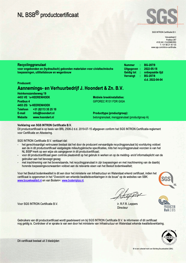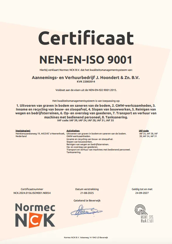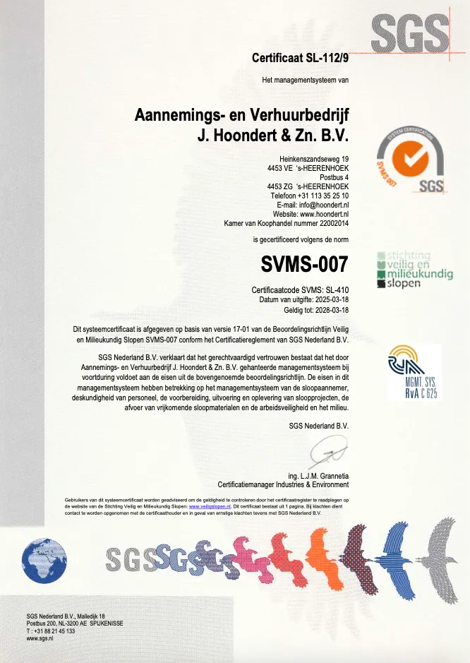 Hoondert is volledig gecertificeerd voor veilig, duurzaam en professioneel werken. Wij hebben alle relevante certificeringen die nodig zijn om onze werkzaamheden volgens de geldende normen en eisen uit te voeren. Deze certificaten vormen de basis voor onze betrouwbare aanpak binnen sloop, sanering, grondwerk, transport en recycling.